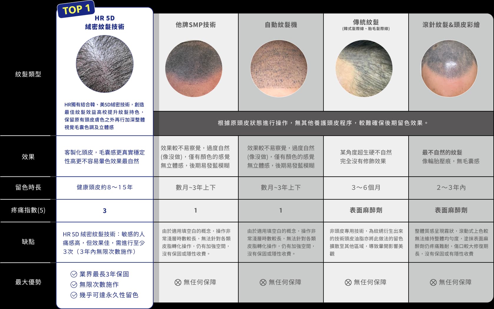 不動刀、不麻藥 (低疼痛),術後日常幾乎不影響,並使用人體無害碳基頭皮色料。